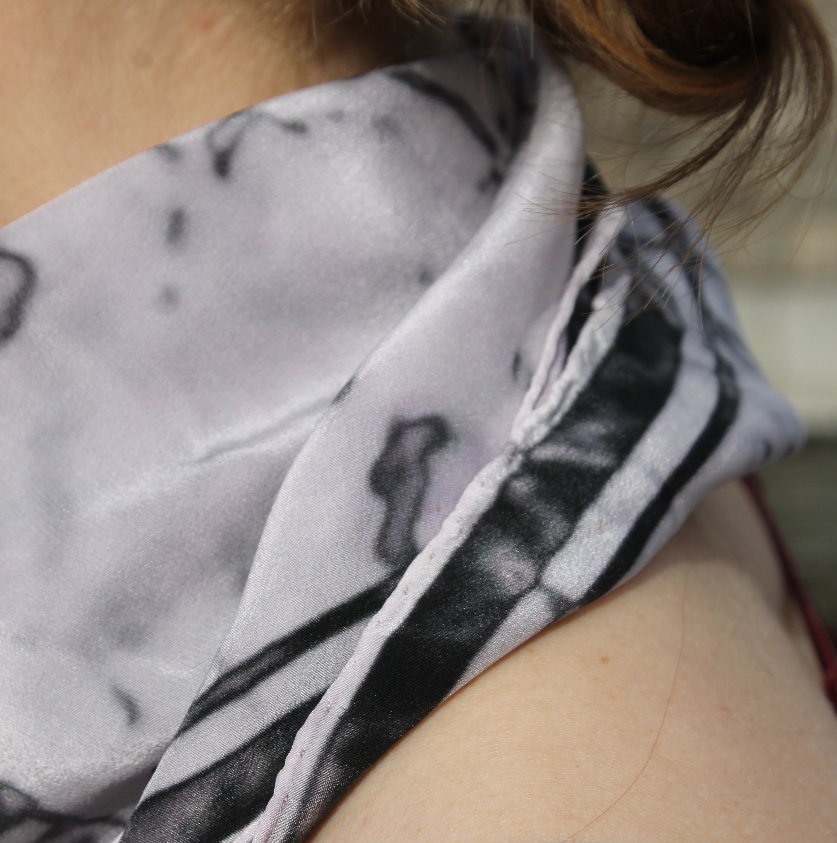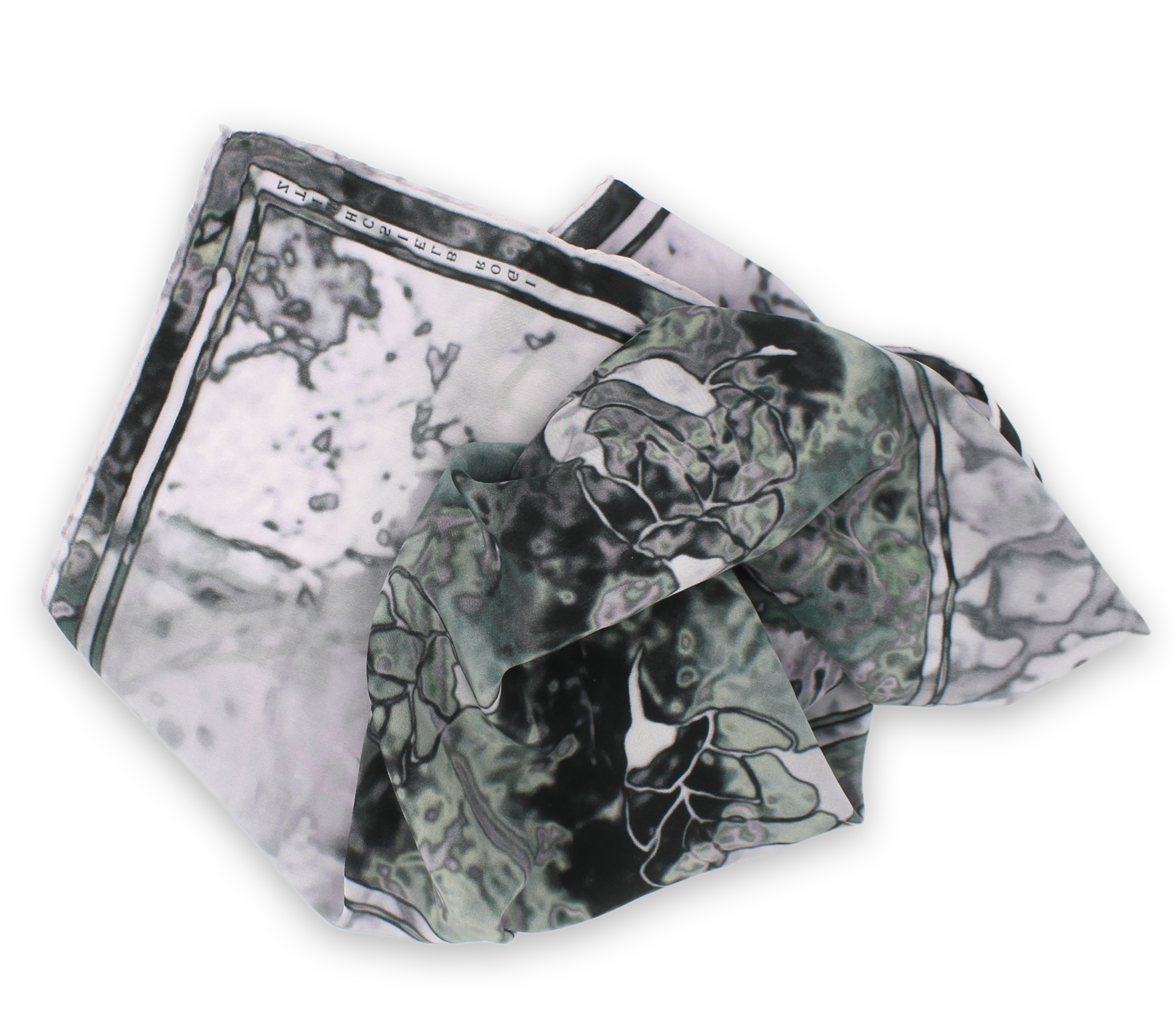 Das Marmor-Muster verleiht dem Tuch eine edle Note und erinnert an die Schönheit von Naturstein, während die floralen Elemente Frische und Lebendigkeit ausstrahlen. Diese harmonische Verbindung macht das Seidentuch zu einem vielseitigen Begleiter.